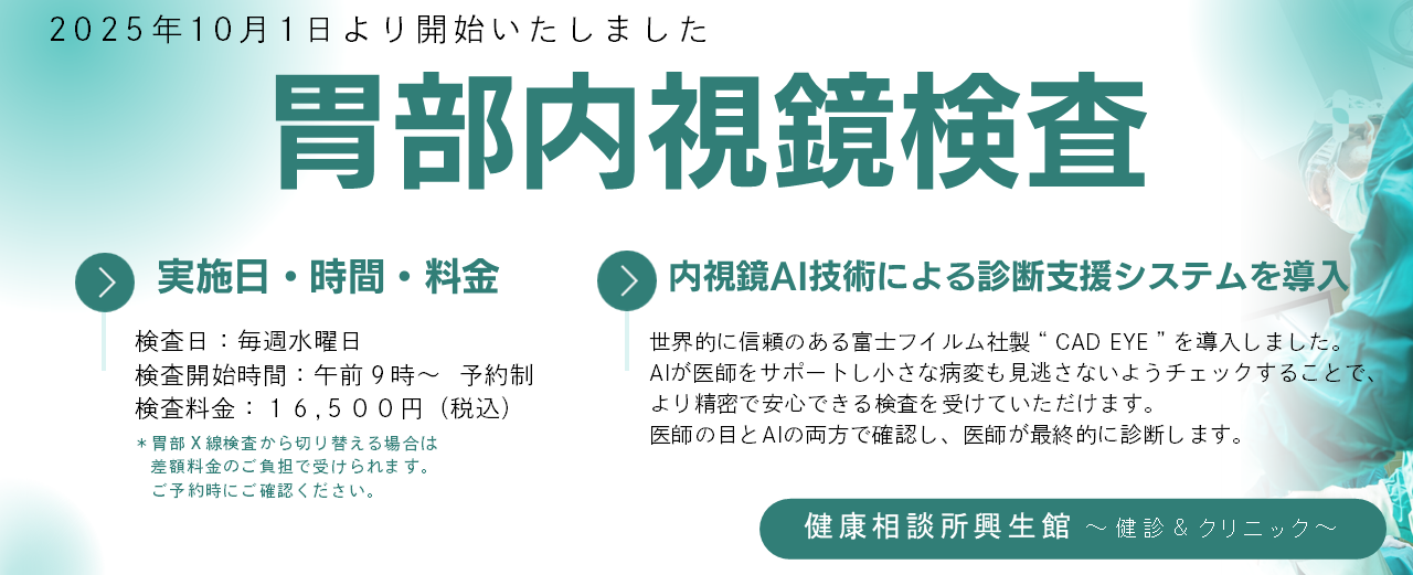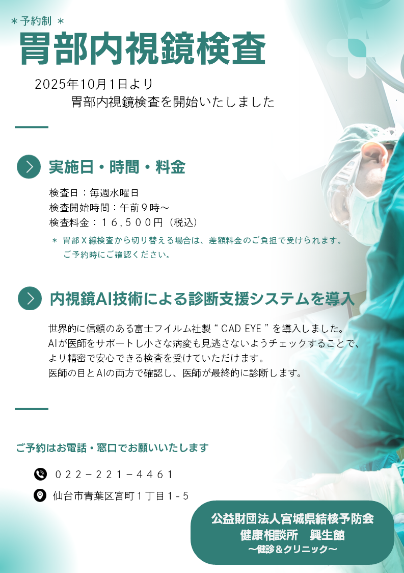 胃部内視鏡検査開始のお知らせ 詳しくはこちらをご覧ください。